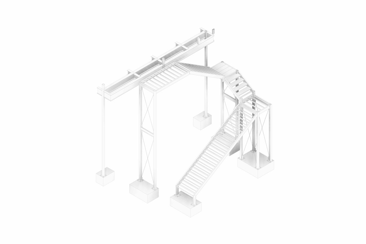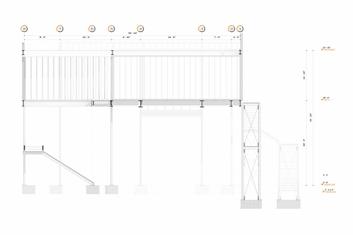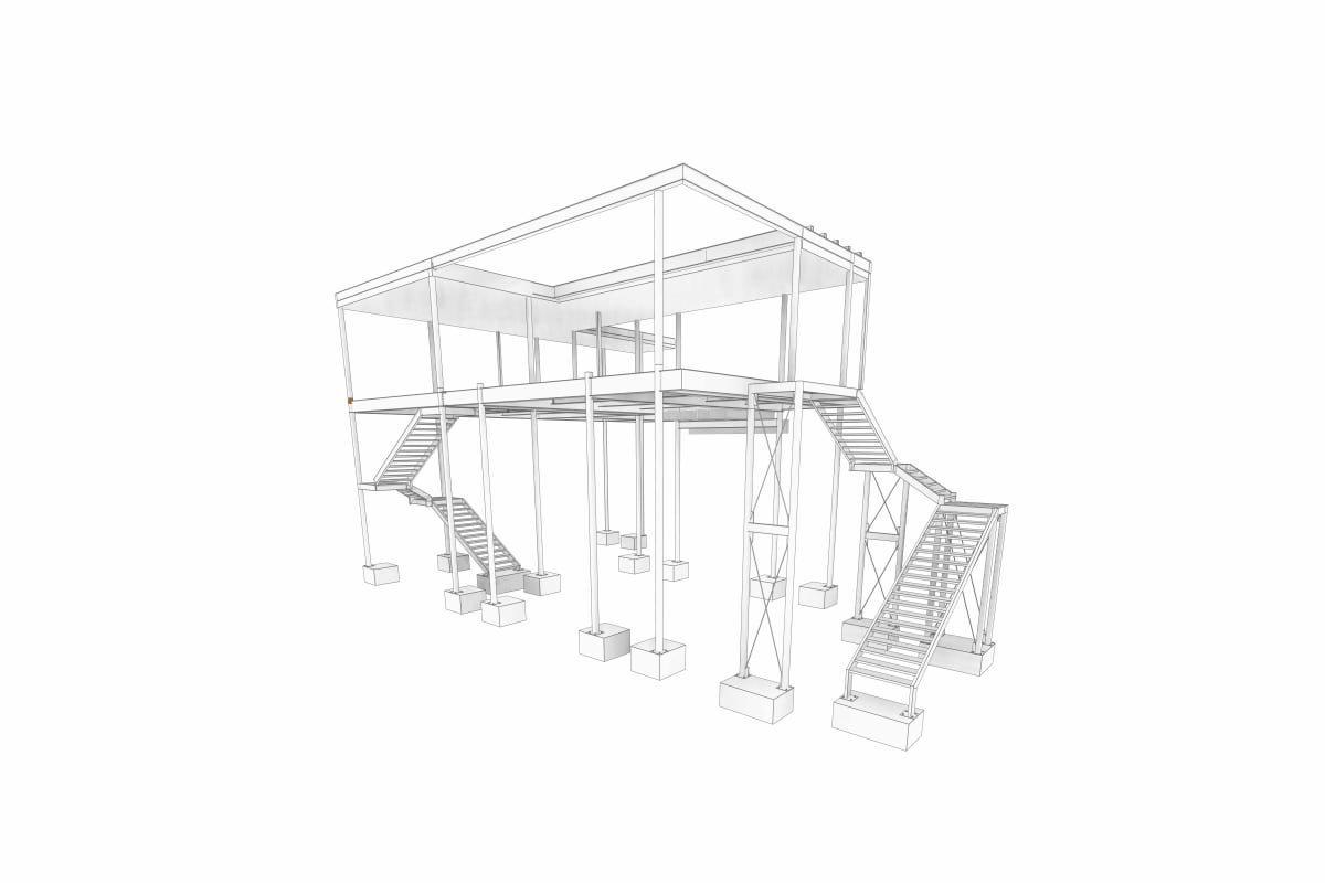 On the upper level, perimeter walls were designed using cold-formed steel (CFS) sections acting as non-structural partitions, while the roof system is composed of purlins and a lightweight roofing assembly.