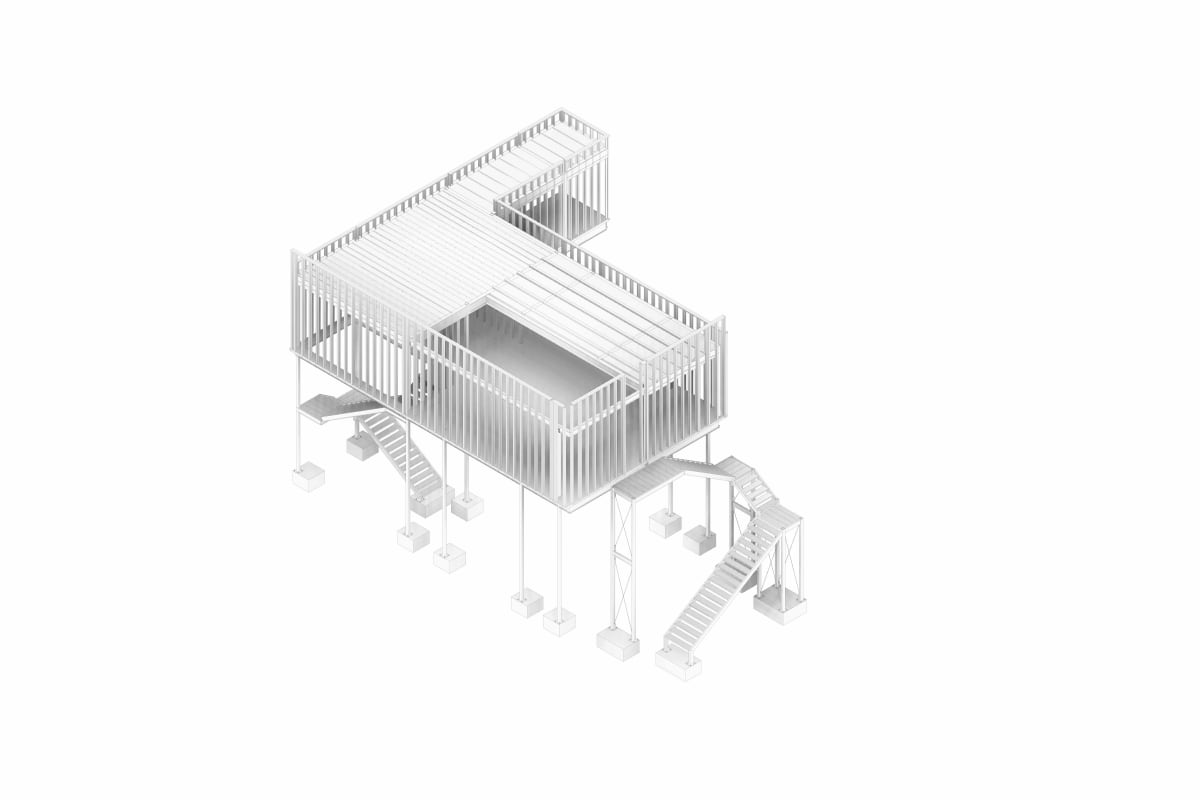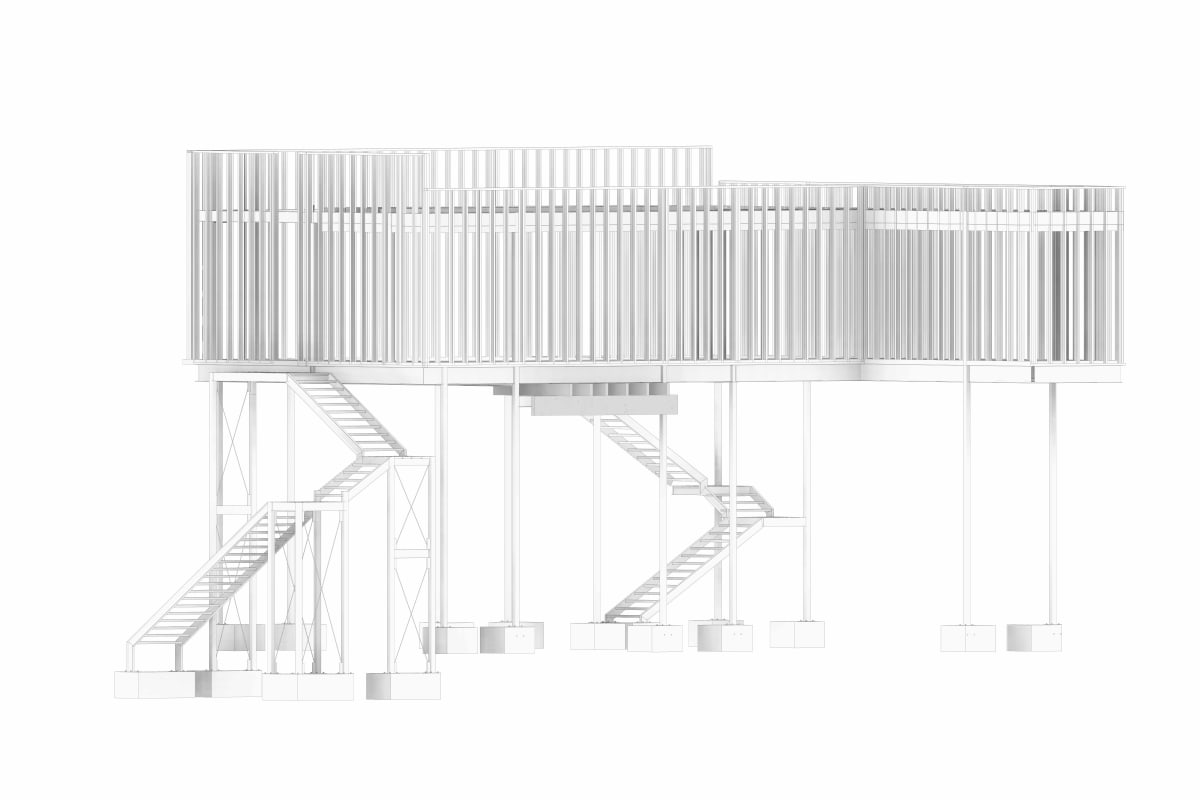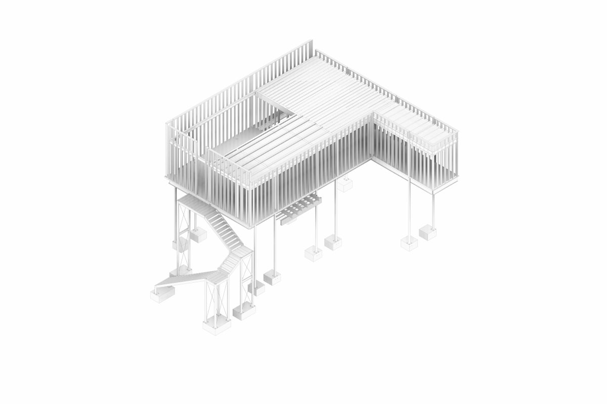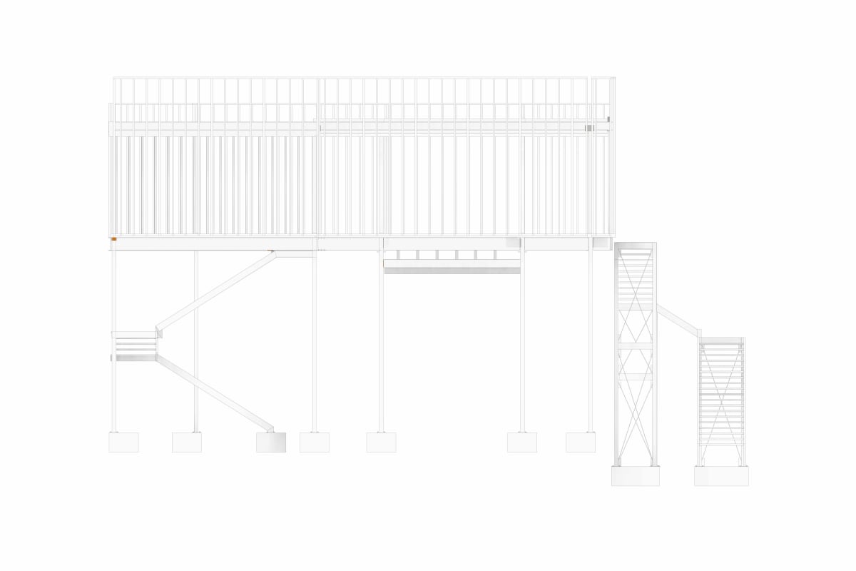 On the upper level, perimeter walls were designed using cold-formed steel (CFS) sections acting as non-structural partitions, while the roof system is composed of purlins and a lightweight roofing assembly.